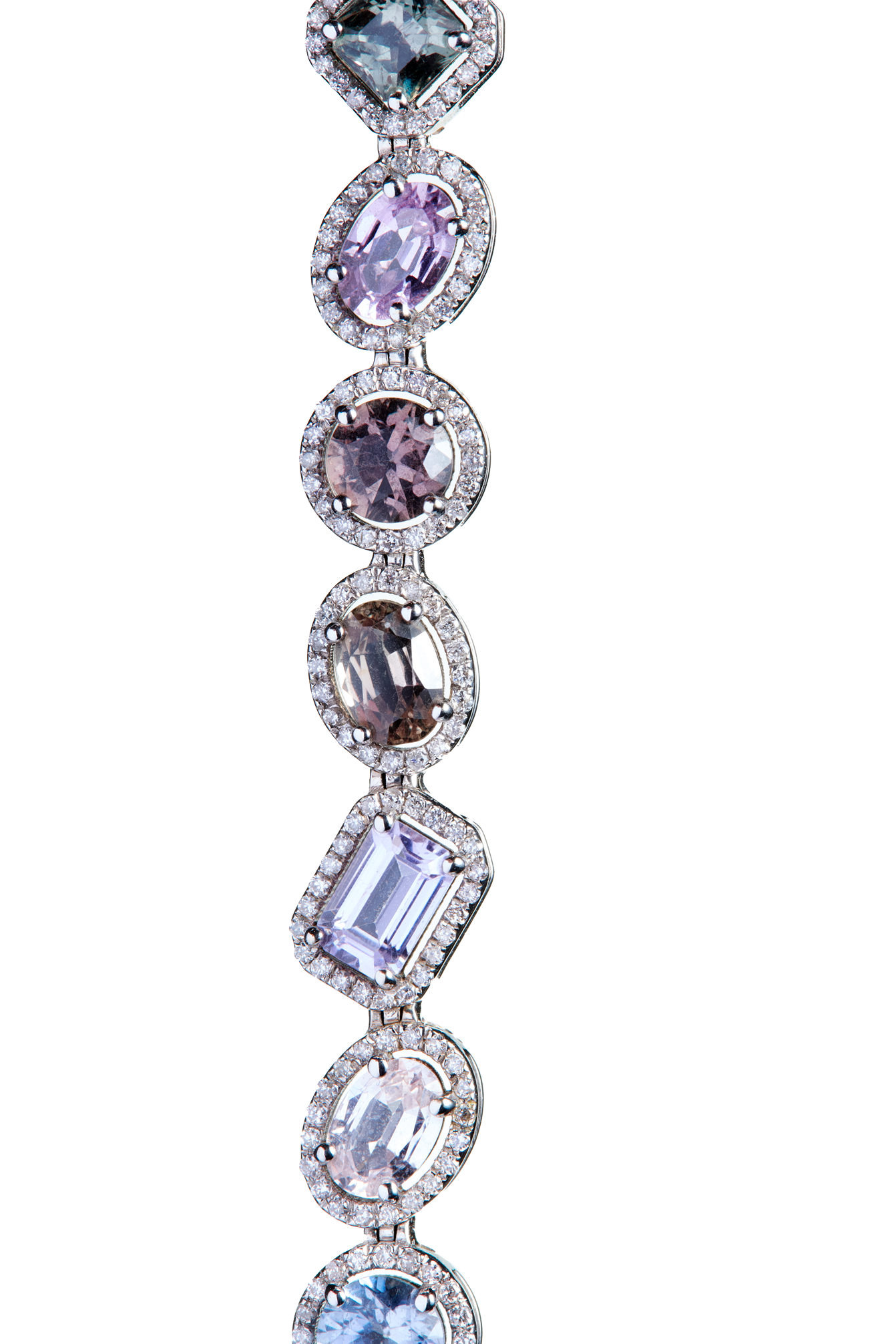 Das Rainbow Saphir Armband ist pure Colour-Vibes in High Jewellery. Gefertigt aus 18 Karat Gold, besetzt mit funkelnden G/VS-Diamanten und einem Spektrum aus facettierten Saphiren in Regenbogenfarben. Jede Form – von oval bis eckig – ist präzise geschliffen und verleiht dem Piece seinen modernen, kunstvollen Charakter.