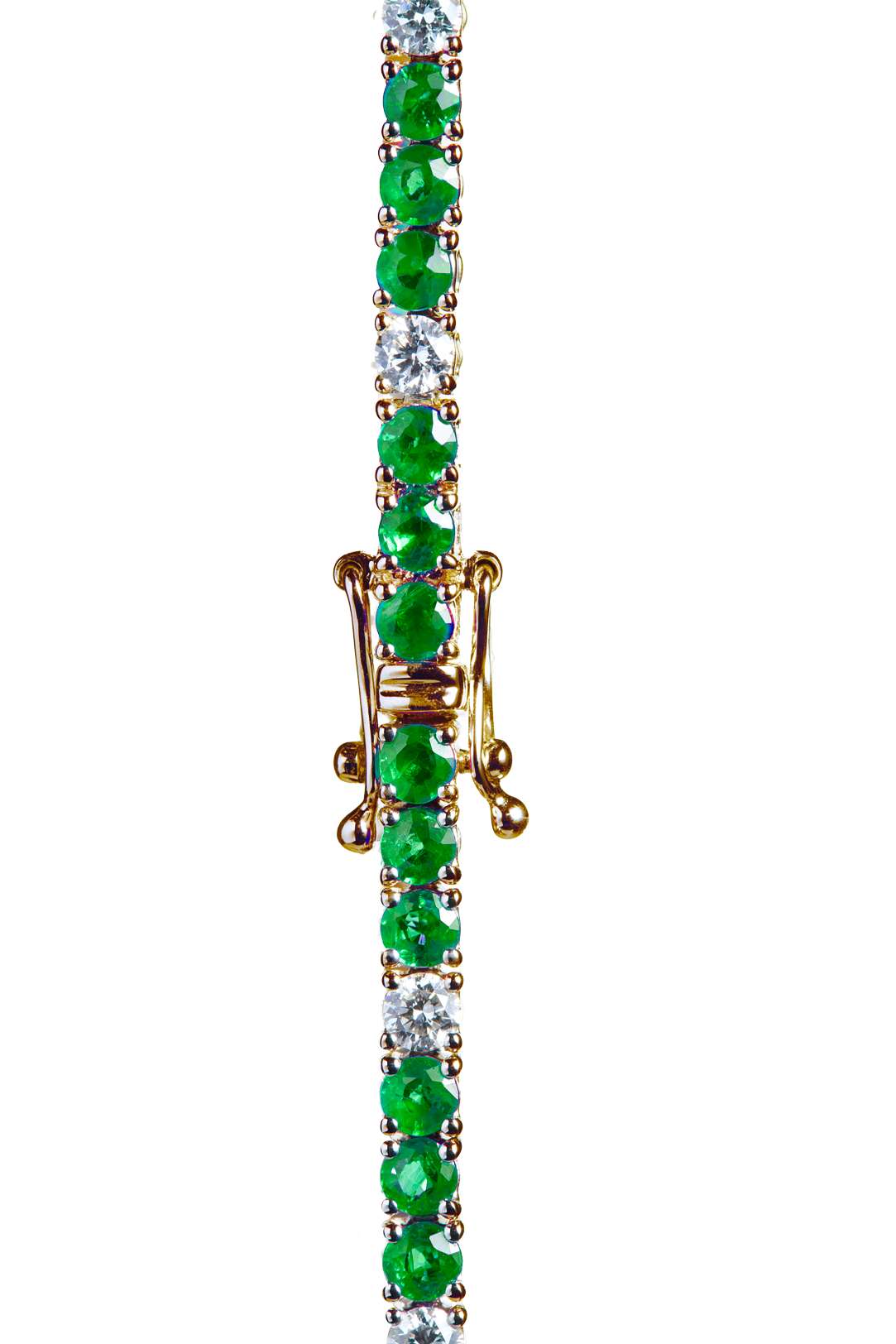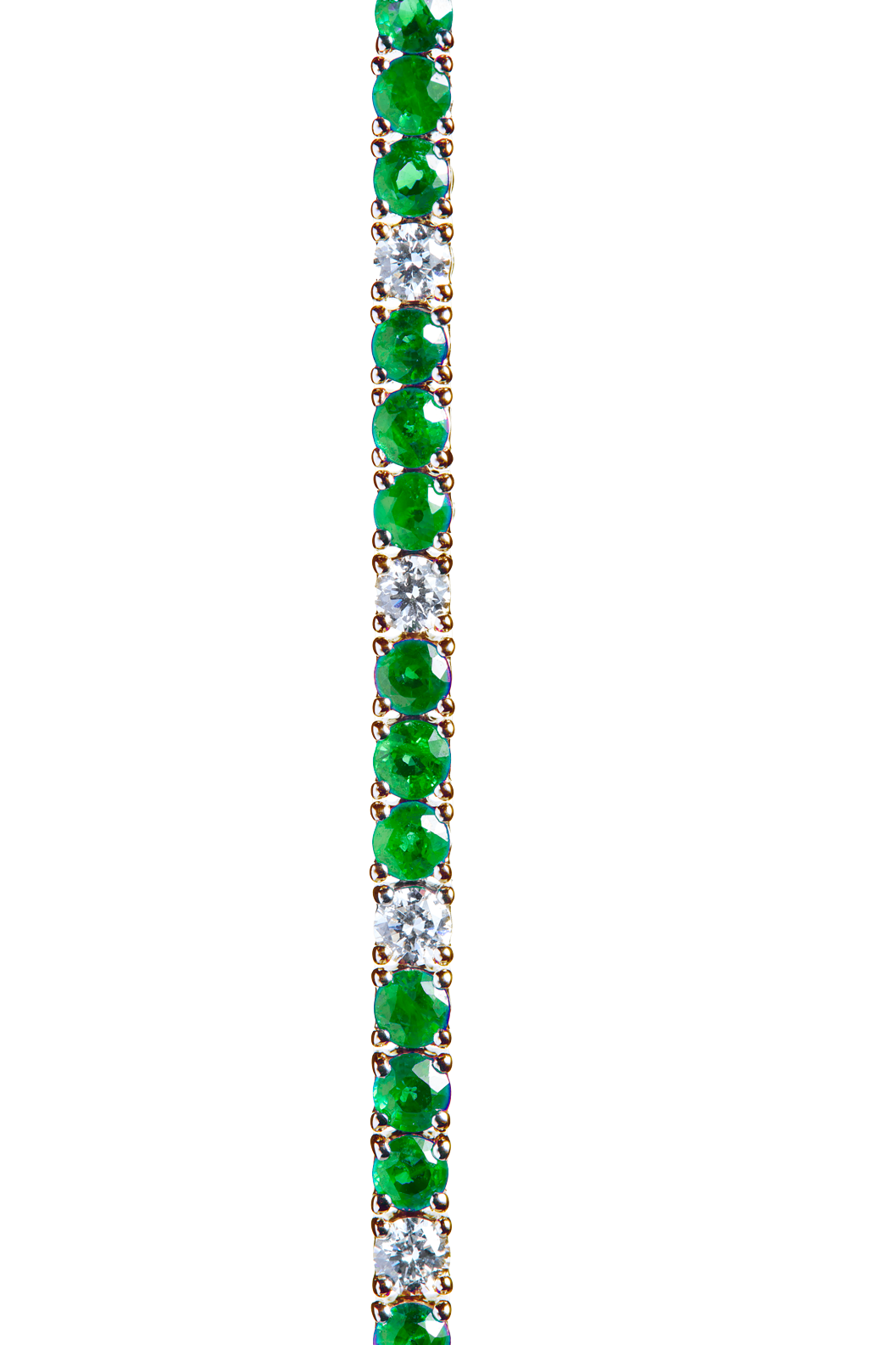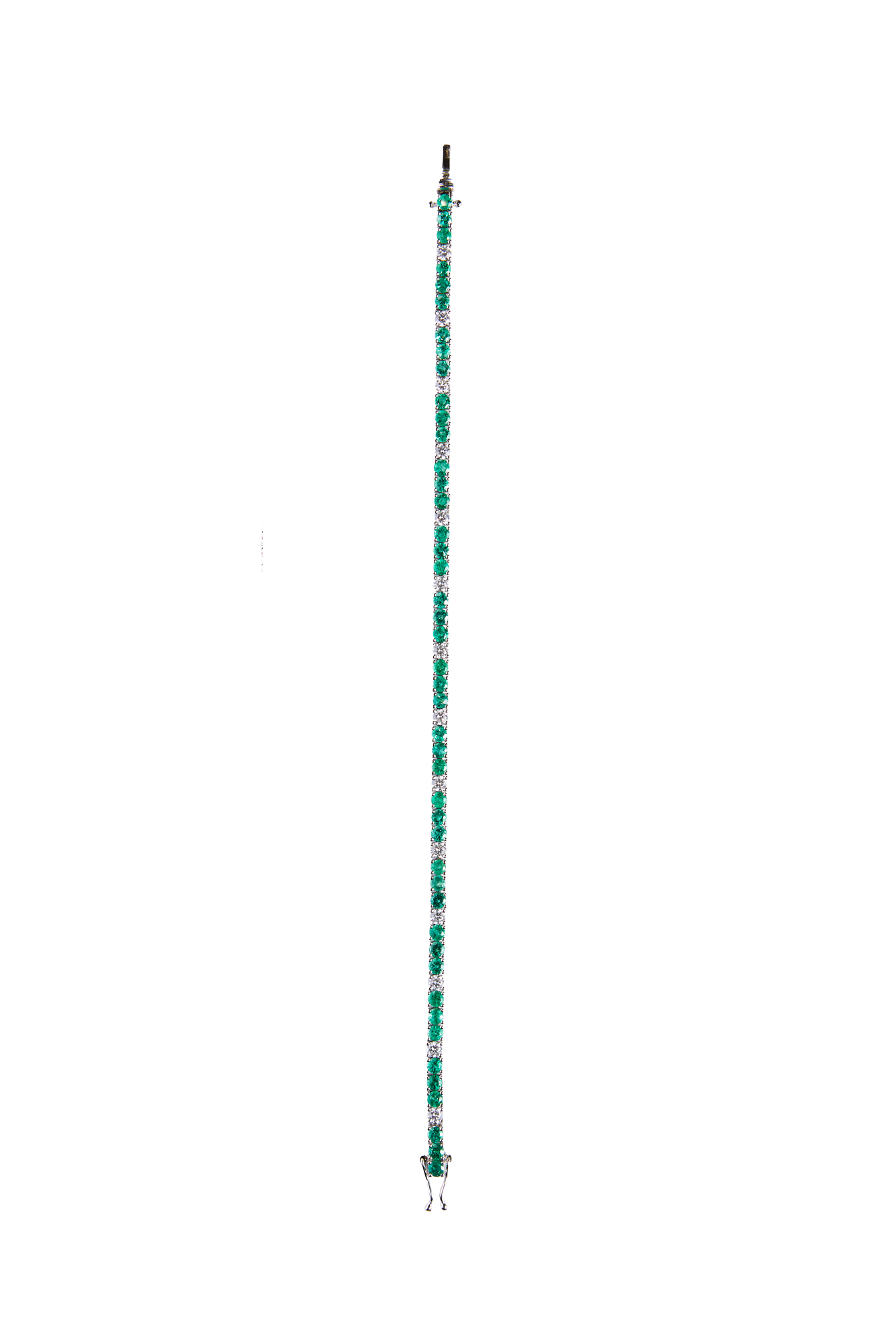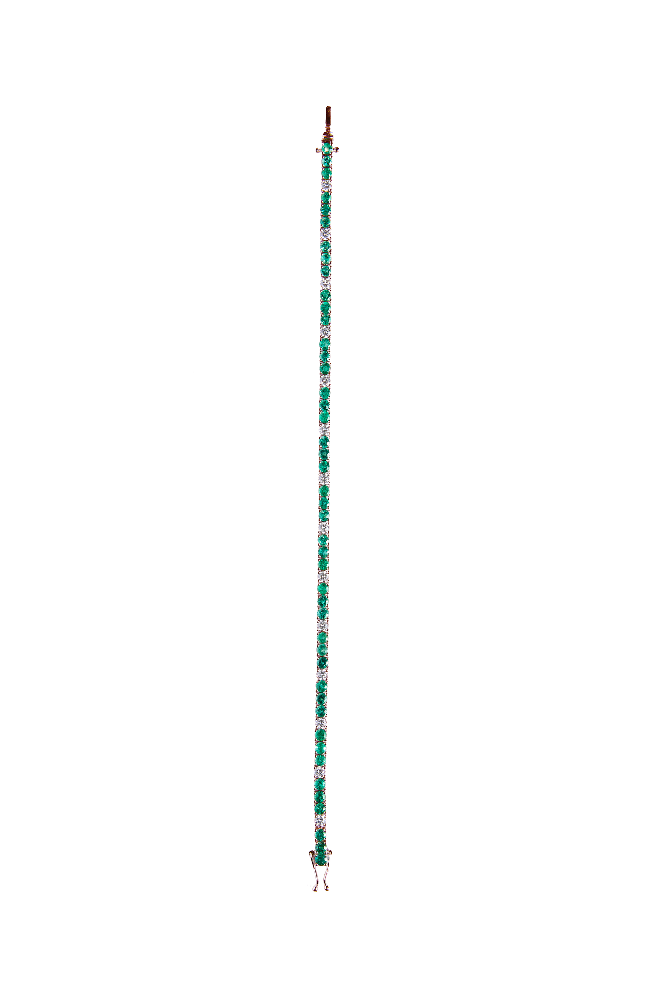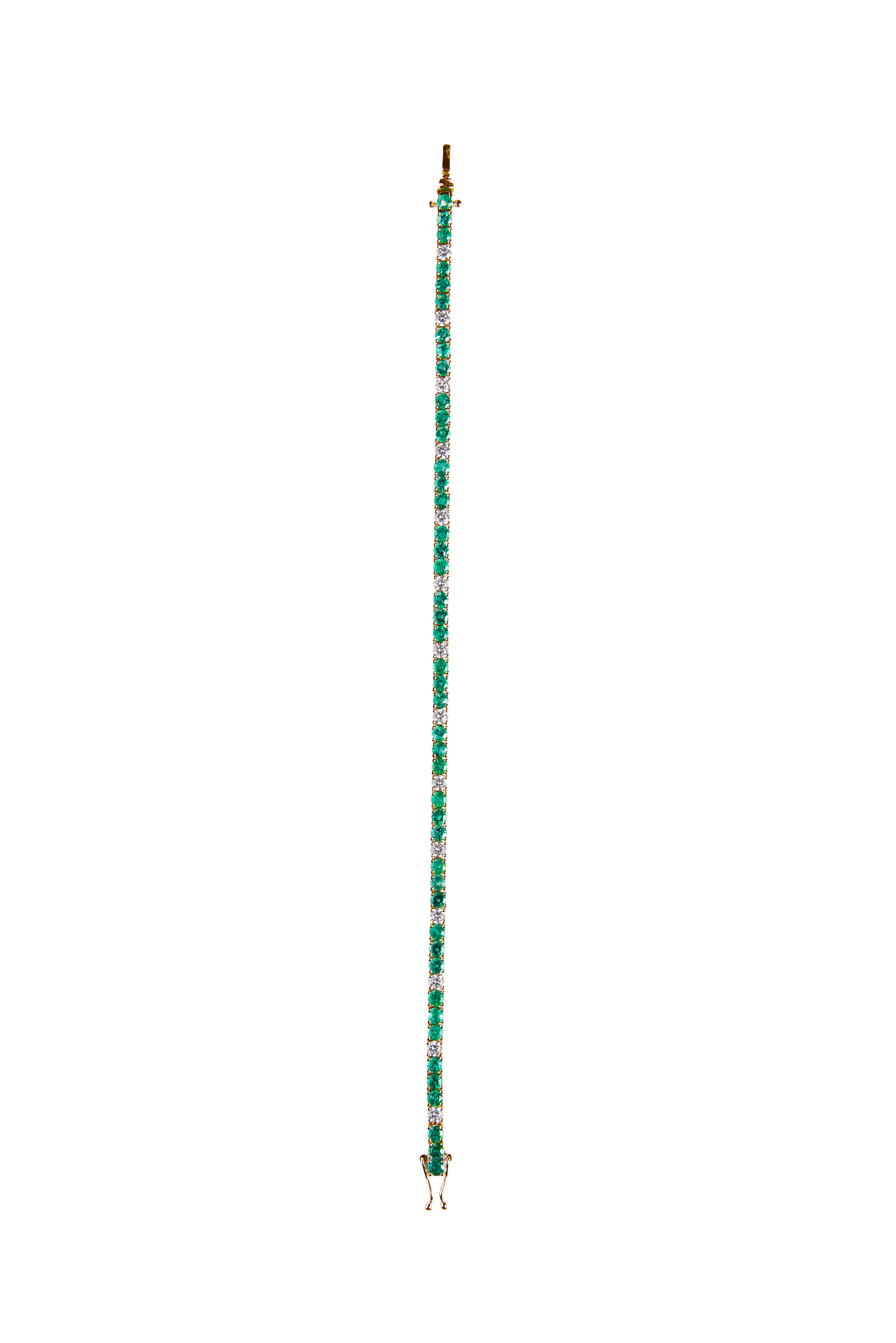 Dieses Tennis Bracelet aus 18 Karat Gold ist ein Meisterwerk der Eleganz. Mit 45 Smaragden, die zusammen 4,3 Carat wiegen, und 14 Diamanten mit einem Gesamtgewicht von 1,3 Carat vereint es die lebendige grüne Farbe der Smaragde mit dem funkelnden Glanz der Diamanten. Ein luxuriöses Accessoire, das mit zeitlosem Stil und exquisitem Design überzeugt.